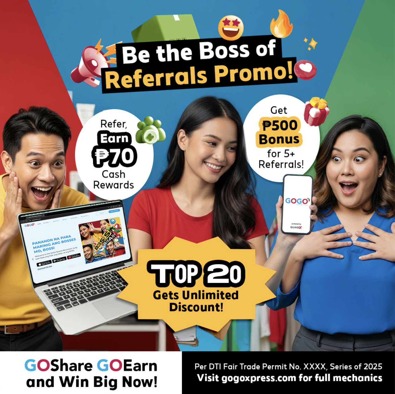 Share the hustle, Boss! Join the GoGo Xpress GoShare GoEarn Top Referrers Challenge. Invite your fellow Bossings to start shipping with GoGo Xpress — they’ll get ₱20 OFF on their first 2 deliveries, and you’ll earn ₱70 cash rewards for every successful referral.